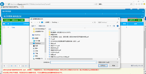 二、上传附件:在电子件列表上点击【电子件管理】,点击【选择文件】,将PDF版电子件上传,