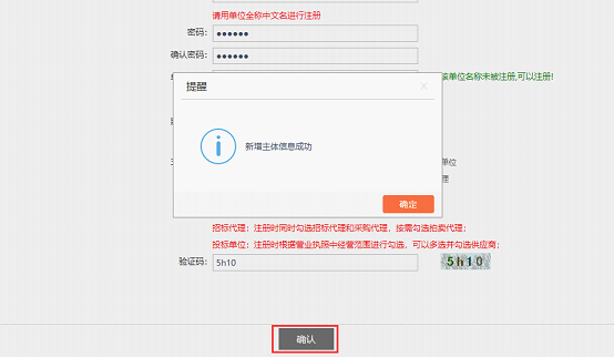 (6)输入验证码点击【确认】,提示“新增主体信息成功”。然后点击【确定】完成登录名信息注册。
