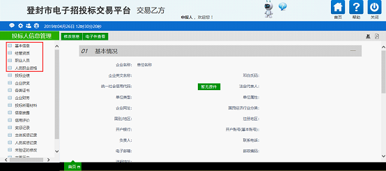 进入交易主体信息库管理,点击左侧栏列表,进入本单位基本信息、职业人员等信息界面。