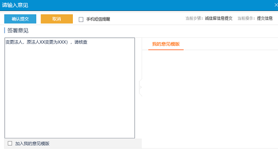 提交信息时,请在意见界面上输入本次变更信息的具体事项,以便审核人员查看(如:变更法人,原法人XX变更为XXX),点击【确认提交】。