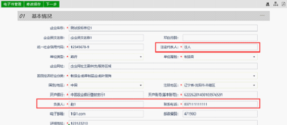 根据实际情况修改并填写需变更的信息(如图所示是法人信息和联系人信息进行变更)。