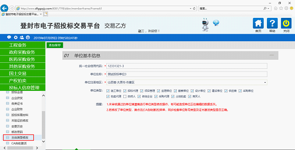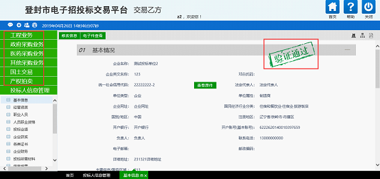 注:交易主体信息库中其他信息(如经营资质、职业人员、人员职业资格、企业业绩财务、获奖等)与基本信息修改方式类似,但交易中心不再进行一致性验证,修改提交后直接验证通过。