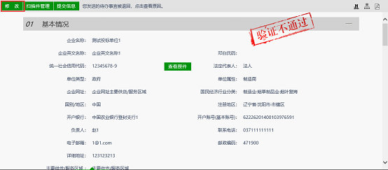 注:审核不通过时,所有电子扫描件状态都会显示验证不通过,请按具体退回意见修改信息即可。
