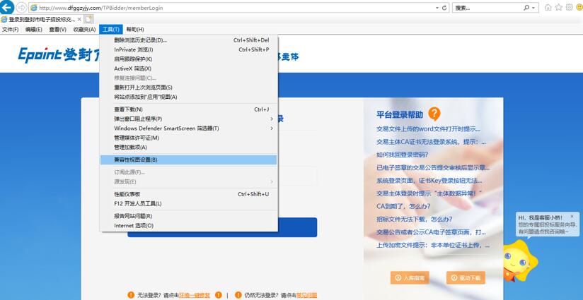 打开交易主体登录页面,点击IE菜单栏——工具——兼容性视图设置(没有显示出来菜单栏的话,直接按空格旁边的alt键会自动展示),如下图: