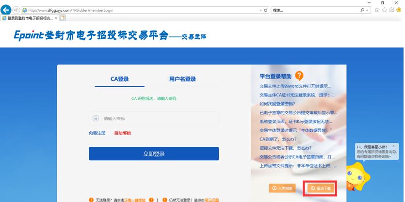 在交易主体登录页面,点击【驱动下载】,下载登封市交易平台驱动程序。