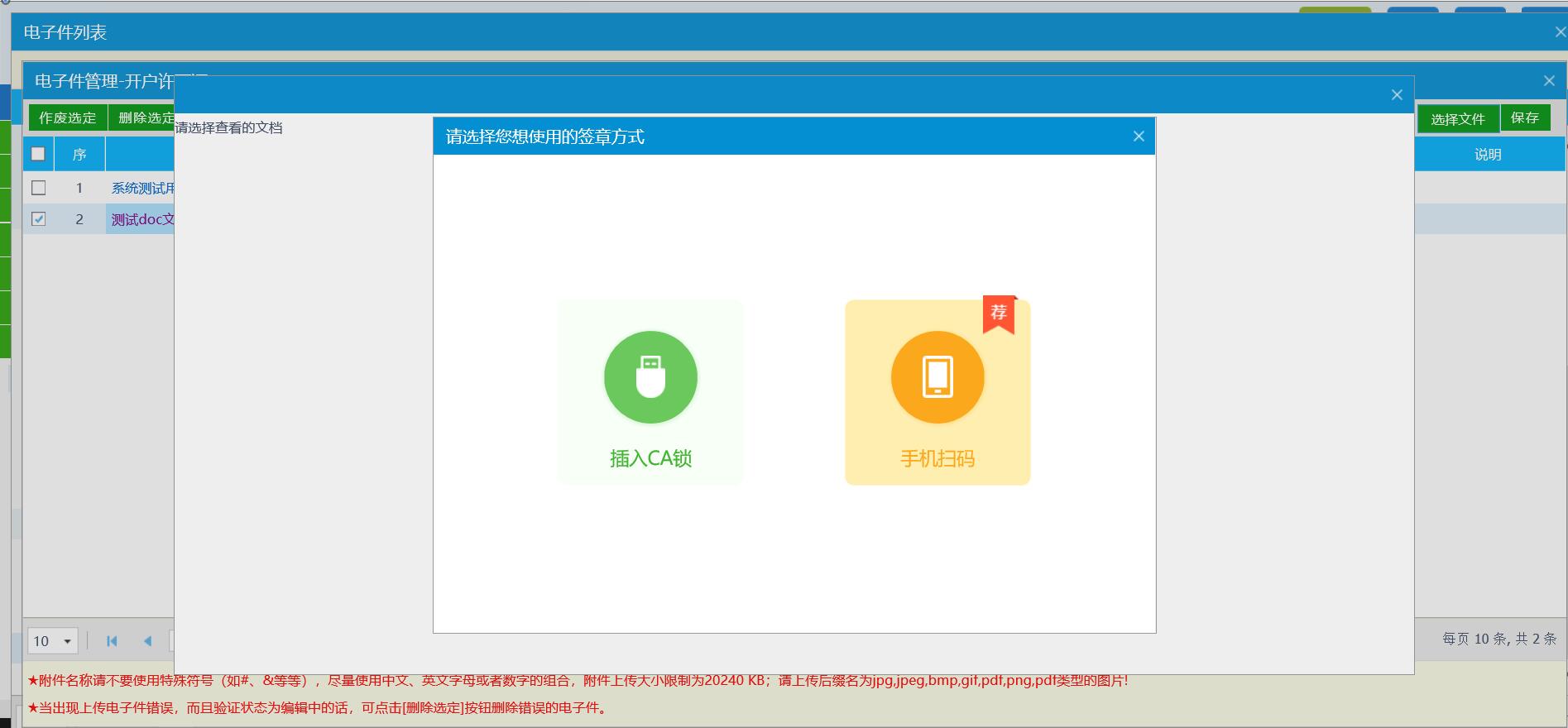 点击电子件名称,弹窗选择签章方式:支持手机标证通扫码签章和插入CA锁签章; ①签章方式1:手机标证通扫码签章 选择【手机扫码】进入文件预览页面,点击左上角的签章按钮 点击完按钮后弹出标证通二维码,使用手机标证通扫码即可进行电子签章 ②签章方式2:插入CA锁签章 选择【插入CA锁签章】进入文件预览页面,点击左上角的签章按钮 点完按钮后会弹出CA 证书密码窗口,输入密码即可进行电子签章; (CA 证书默认初始密码:111111) 所有签章都签章完毕后,点击右上角【×】关闭当前页面即可。 注: (1)点击页面右上角【X】关闭当前页面后,无法在该电子件上再加盖其他电子签章,因此电子件要加盖多个电子印章时,请在所有电子签章加盖完成后再关闭当前页面。