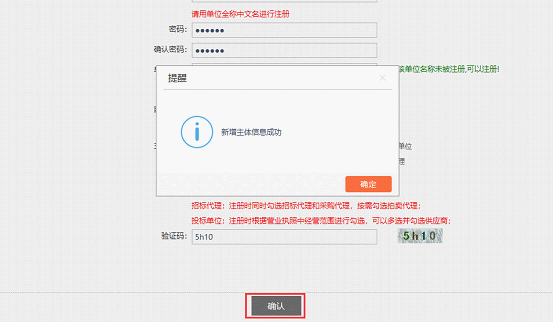 输入验证码点击【确认】,提示“新增主体信息成功”。然后点击【确定】完成登录名信息注册(备注:此时只是单位名称等身份类型信息注册,所有交易主体(除产权竞买人外)必须办理完CA数字证书后,再完善诚信库并提交信息入库)。