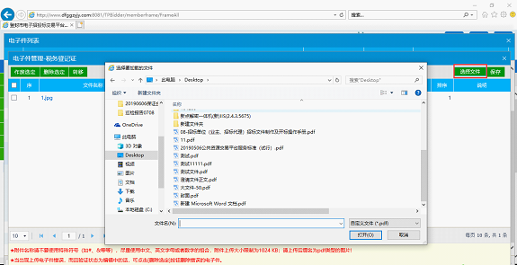 在电子件列表上点击“电子件管理”,点击“选择文件”将pdf版电子件上传到系统中:
