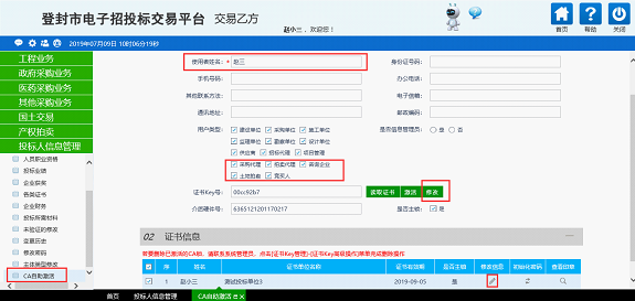 在打开“CA自助激活”页面,点击下方的“信息修改”按钮,重新勾选用户类型身份,并插入本单位CA后点击“修改”完成CA锁与新身份类型绑定。