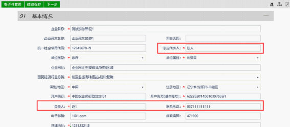 6.1.2、根据实际情况编辑、修改需变更的信息(如图所示是法人信息和联系人信息进行变更)。
