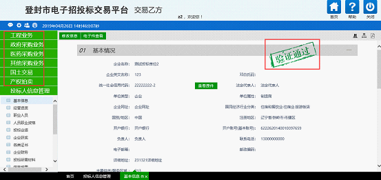 4.5.7、交易中心工作人员验证基本信息,验证通过后,系统页面会出现“验证通过”标记,交易主体即可进行网上业务操作。