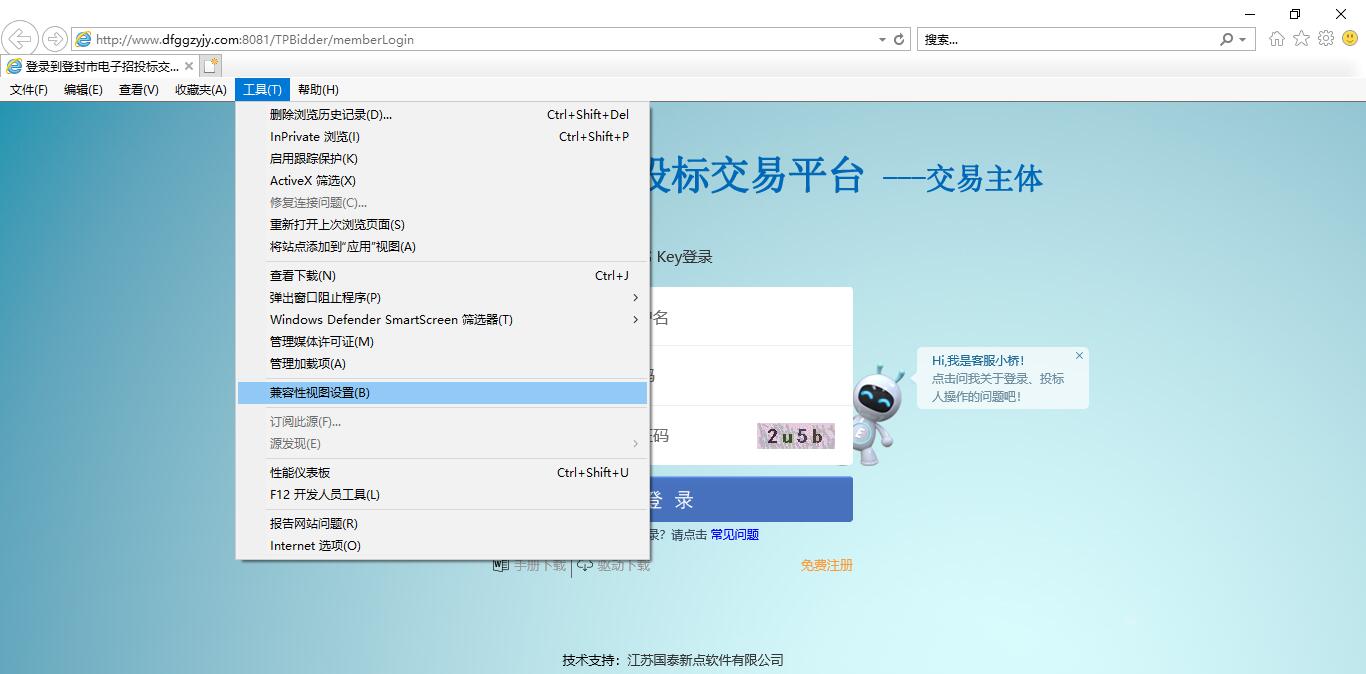 打开交易主体登录页面,点击IE菜单栏——工具——兼容性视图设置(没有显示出来菜单栏的话,直接按空格旁边的alt键会自动展示),如下图: