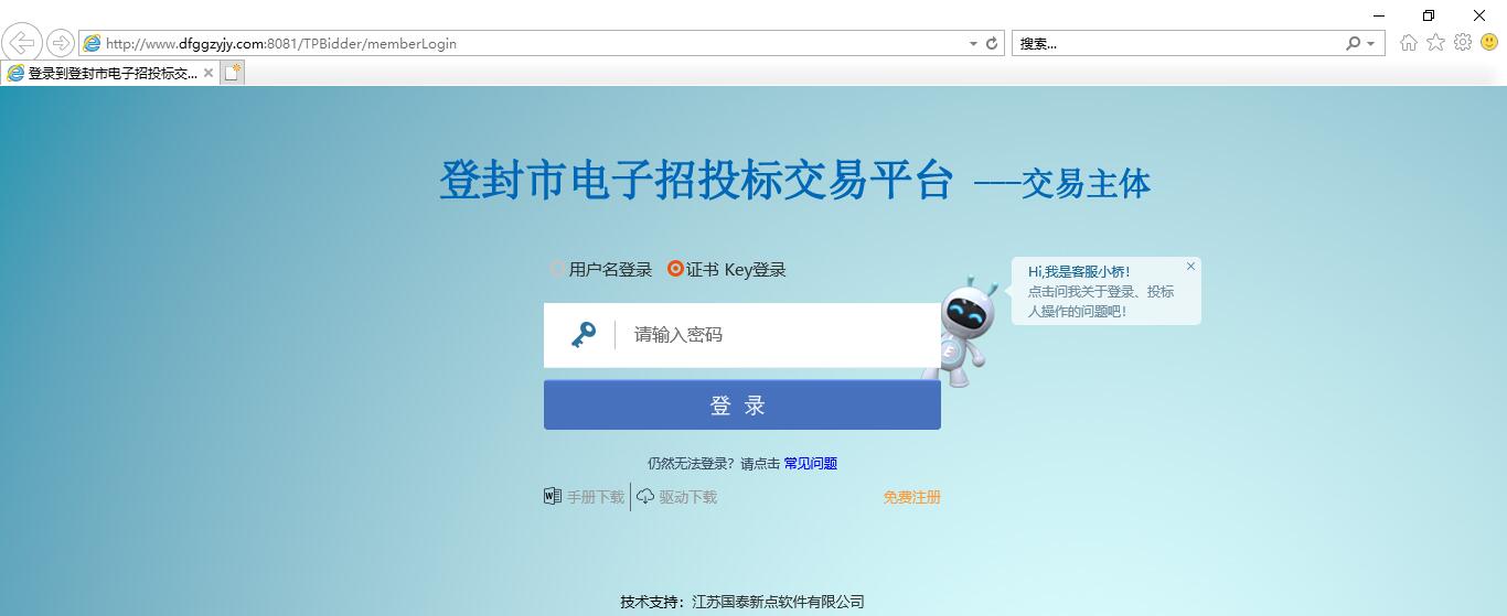 系统驱动安装完成后选择“证书key登录”,输入CA口令进入交易主体系统。