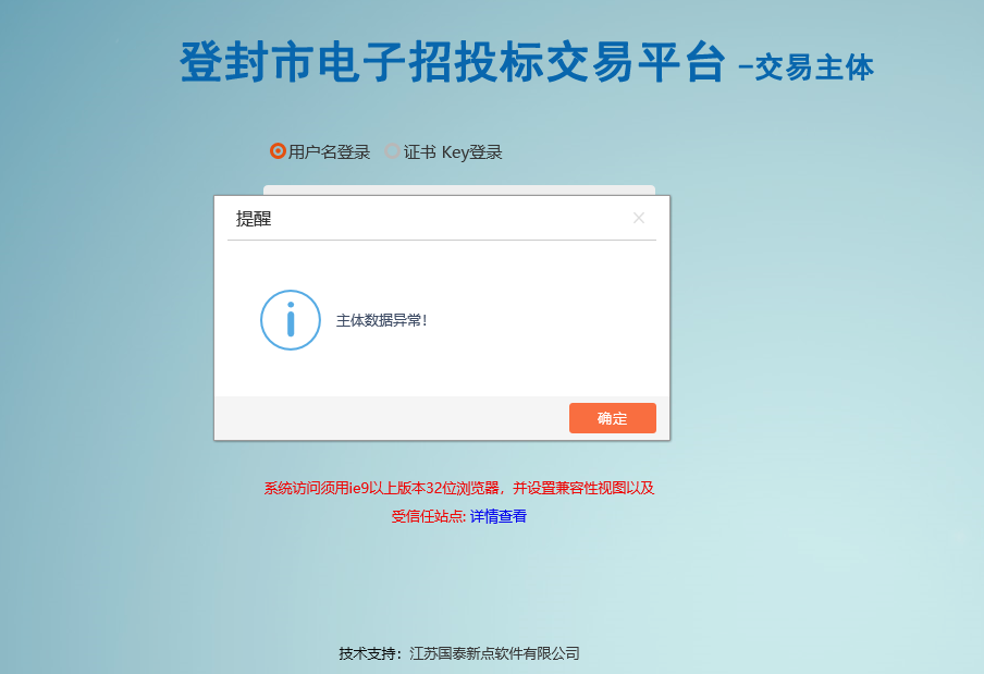问题现象:交易主体登录页面,正确的用户名和密码登录或者CA证书登录后,提示“主体数据异常!”,如下图所示: