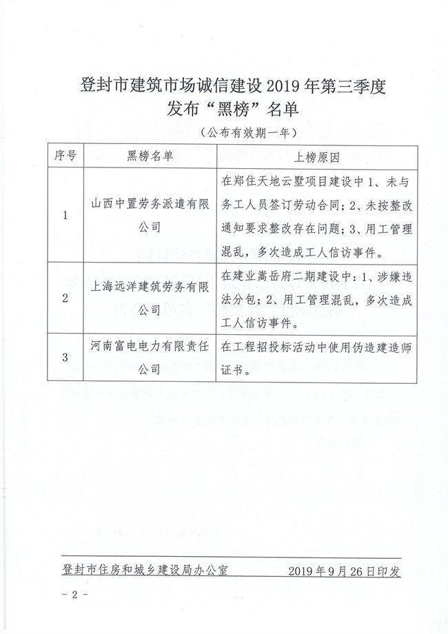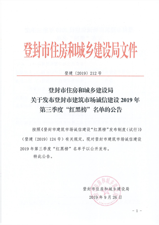 登封市住房和城乡建设局关于发布登封市建筑市场诚信建设2019年第三季度“红黑榜”名单的公告